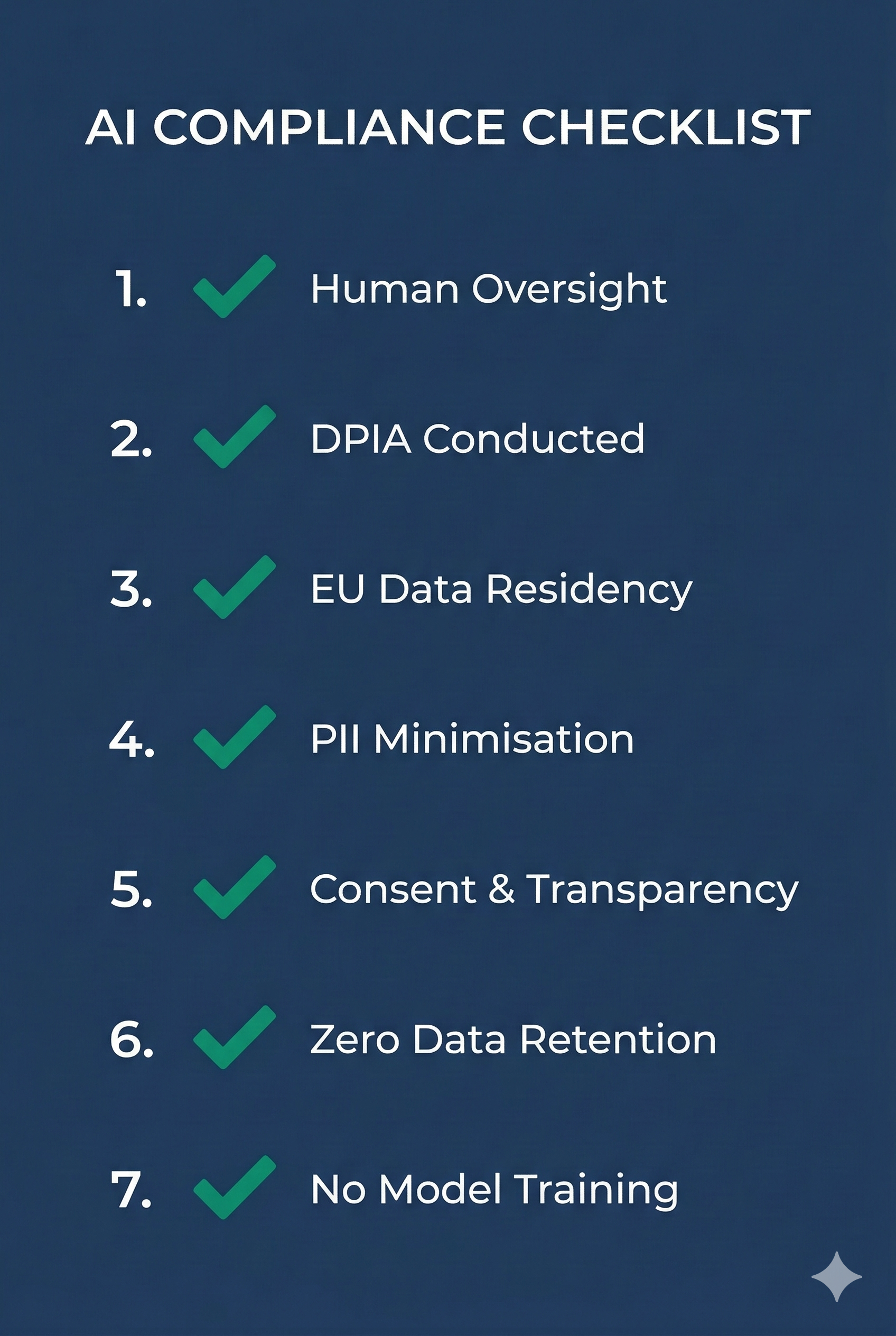 7-point AI compliance checklist for Irish schools covering human oversight, DPIA, EU data residency, PII minimisation, consent, zero data retention, and no model training