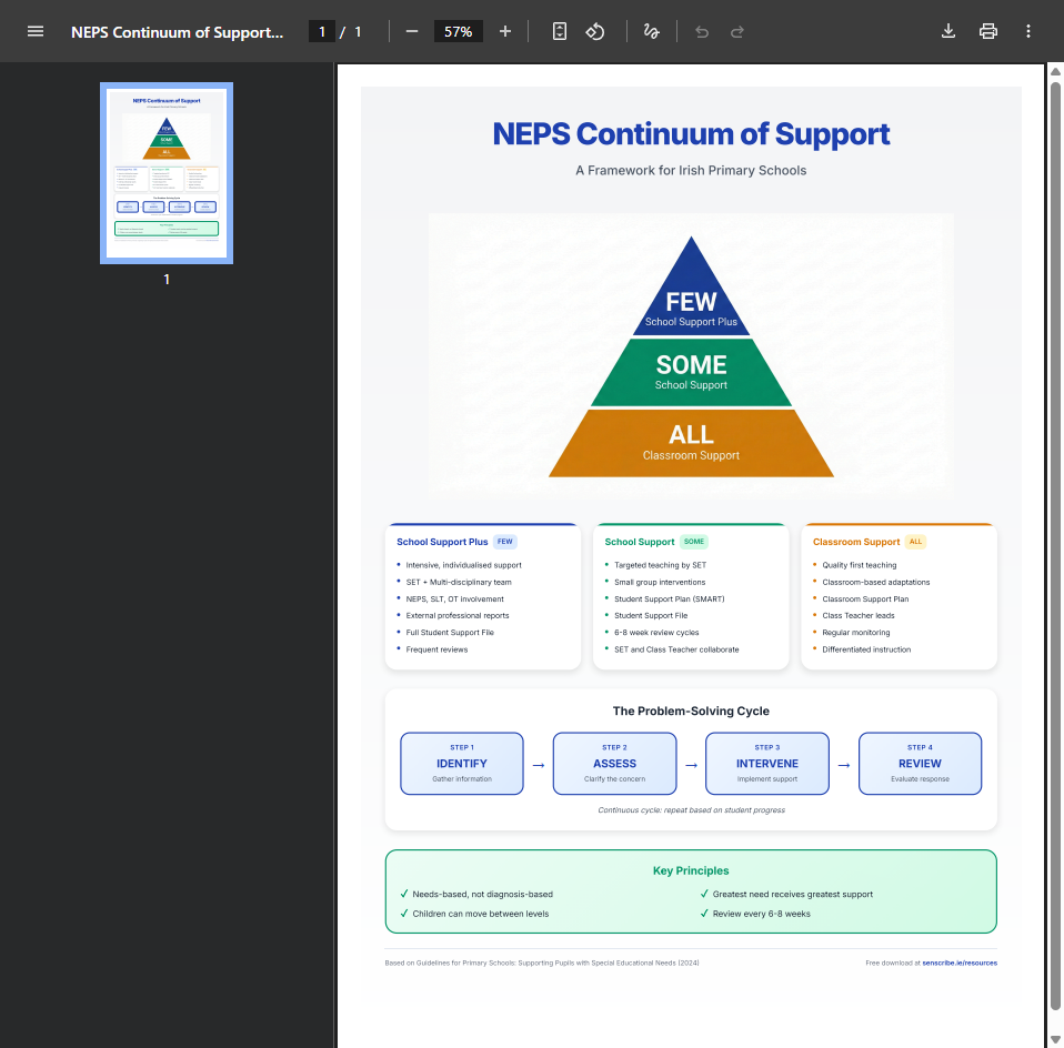 Yes, this poster is completely free to download, print, and use in your school. It is provided by SENScribe to support Irish primary school teachers with understanding and implementing the Continuum of Support framework.