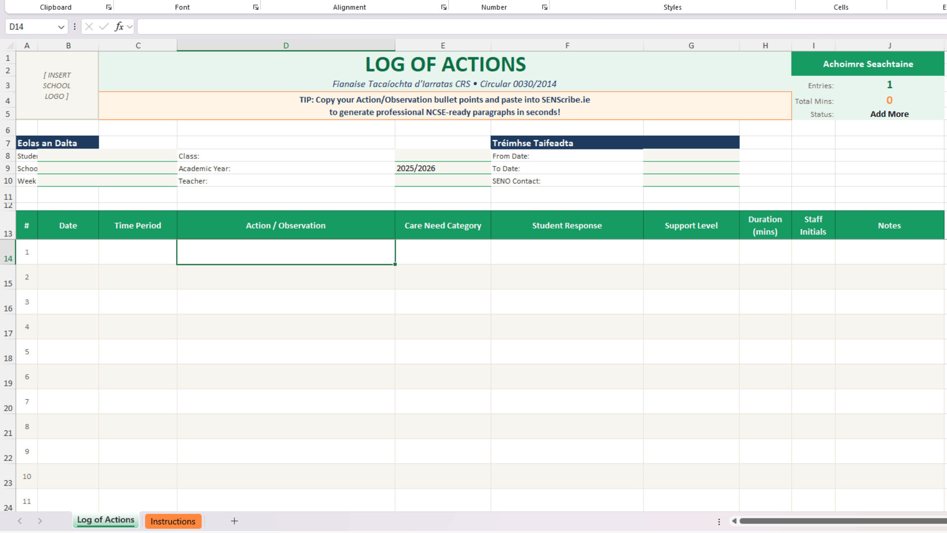 A professional Excel template for tracking SNA care needs and actions as required by Circular 0030/2014. Features dropdown menus for care categories, automatic weekly statistics, and NCSE-compliant formatting. Includes a customisable school logo placeholder and comprehensive instructions.