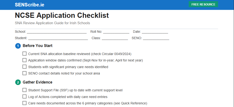 Yes, this checklist is completely free to download, print, and use in your school. It is provided by SENScribe to support Irish teachers with the NCSE SNA application process.